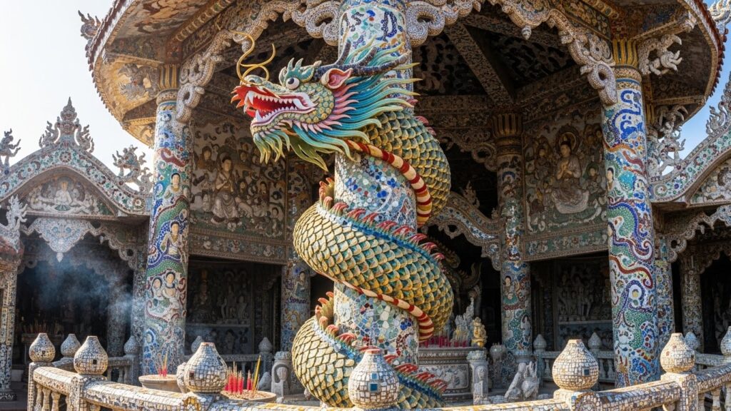 깨진 도자기와 유리 조각을 이어 붙여 만든 린푸옥 사원은 그 정교함과 화려함에 입이 떡 벌어지게 만듭니다.