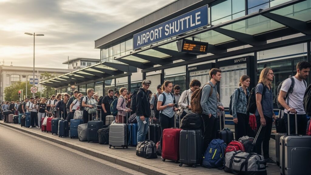 2. 무료 셔틀버스 정류장 줄 서기 (사람 많음)